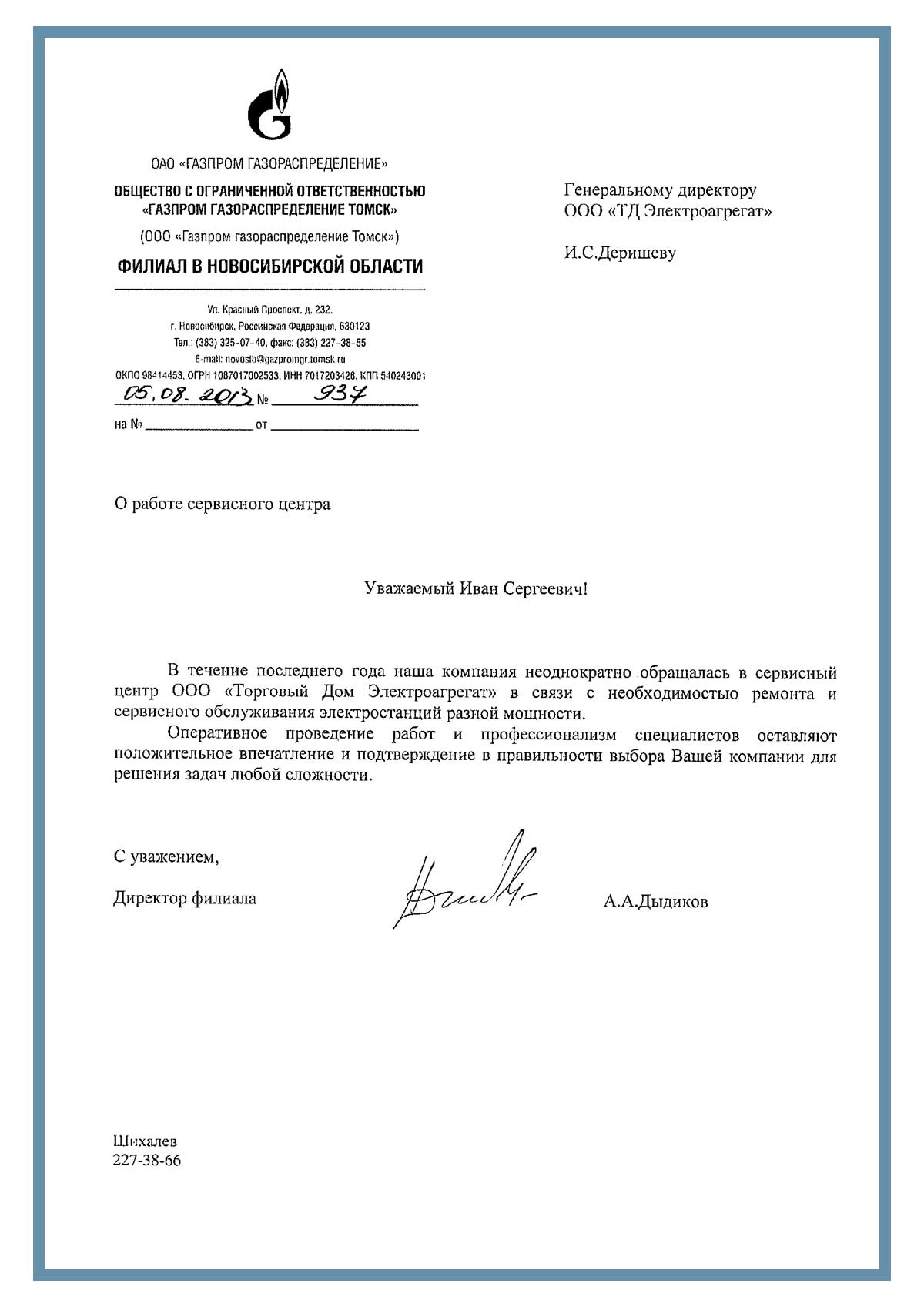Отзыв от ООО "Газпром газораспределение Томск" филиал Новосибирская обл.